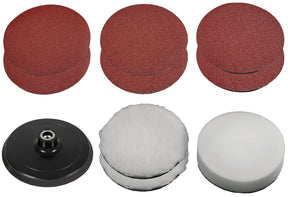 • Cuprins - Setul de accesorii include 2x boneta de lustruire sintetica, 1x atasament pentru spuma si cate 2x hartie de slefuit P60, P80 si P120 si un tampon de lustruire.
