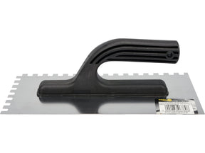 Gletiera de dimensiunea 270x125 mm din oțel inoxidabil cu dinți de 8 mm. Mâner confortabil și ușor din plastic. Esențiala atunci când aplicați adezivi, tencuieli și grunduri.