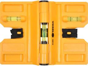 Nivela pentru colturi din plastic ABS. Are trei flacoane tradiționale pentru poziționarea precisă a elementelor structurale testate. Are o curea de cauciuc pentru fixarea la lemn sau beton și patru magneți pentru fixarea la metal.